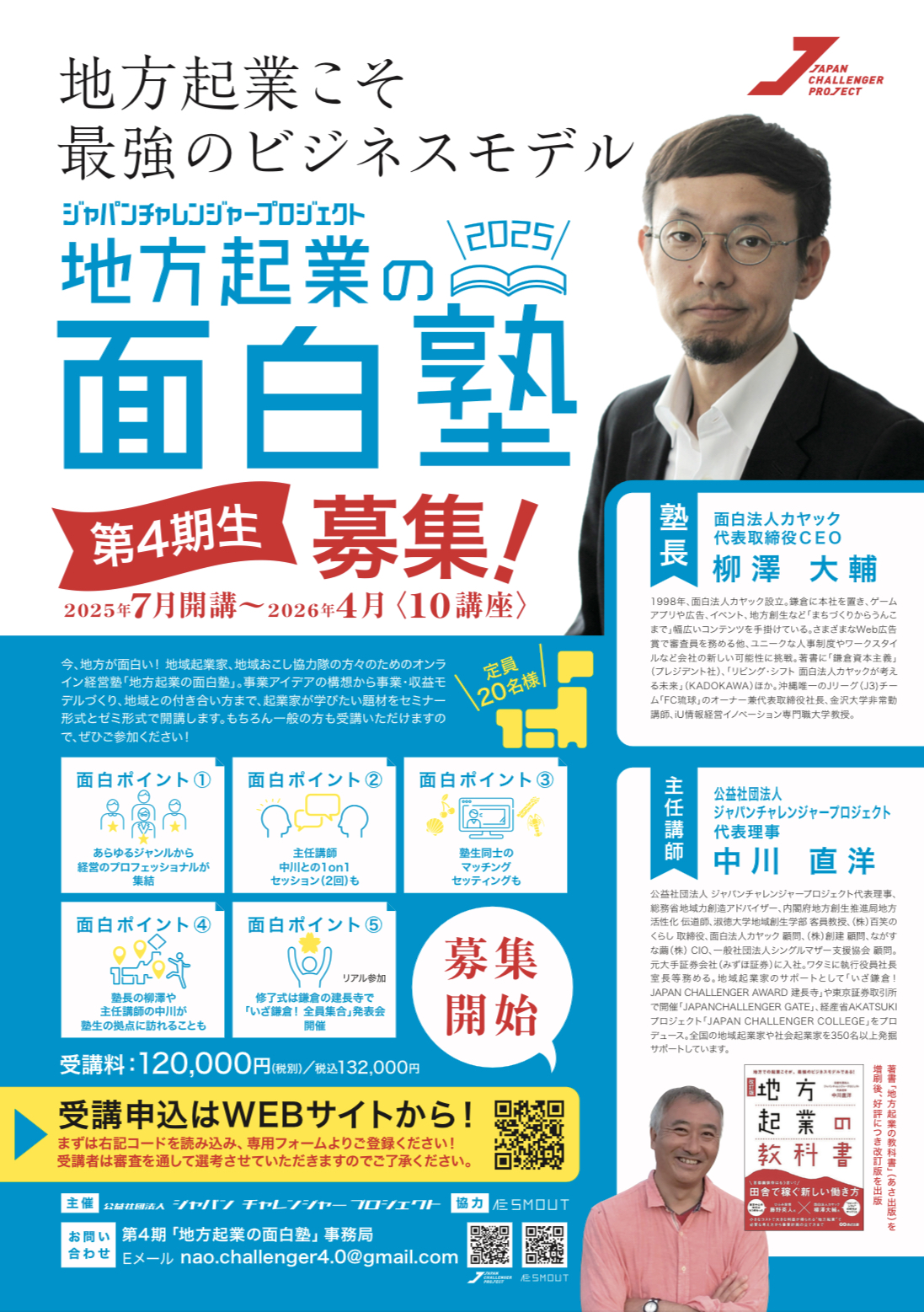 「地方起業の面白塾」は、事業アイデアの構想から事業・収益・モデルづくり・地域との付き合い方まで、ビジネスの最前線で活躍する豪華講師陣と、全国各地でチャレンジする地域起業家から学び尽くす塾です。