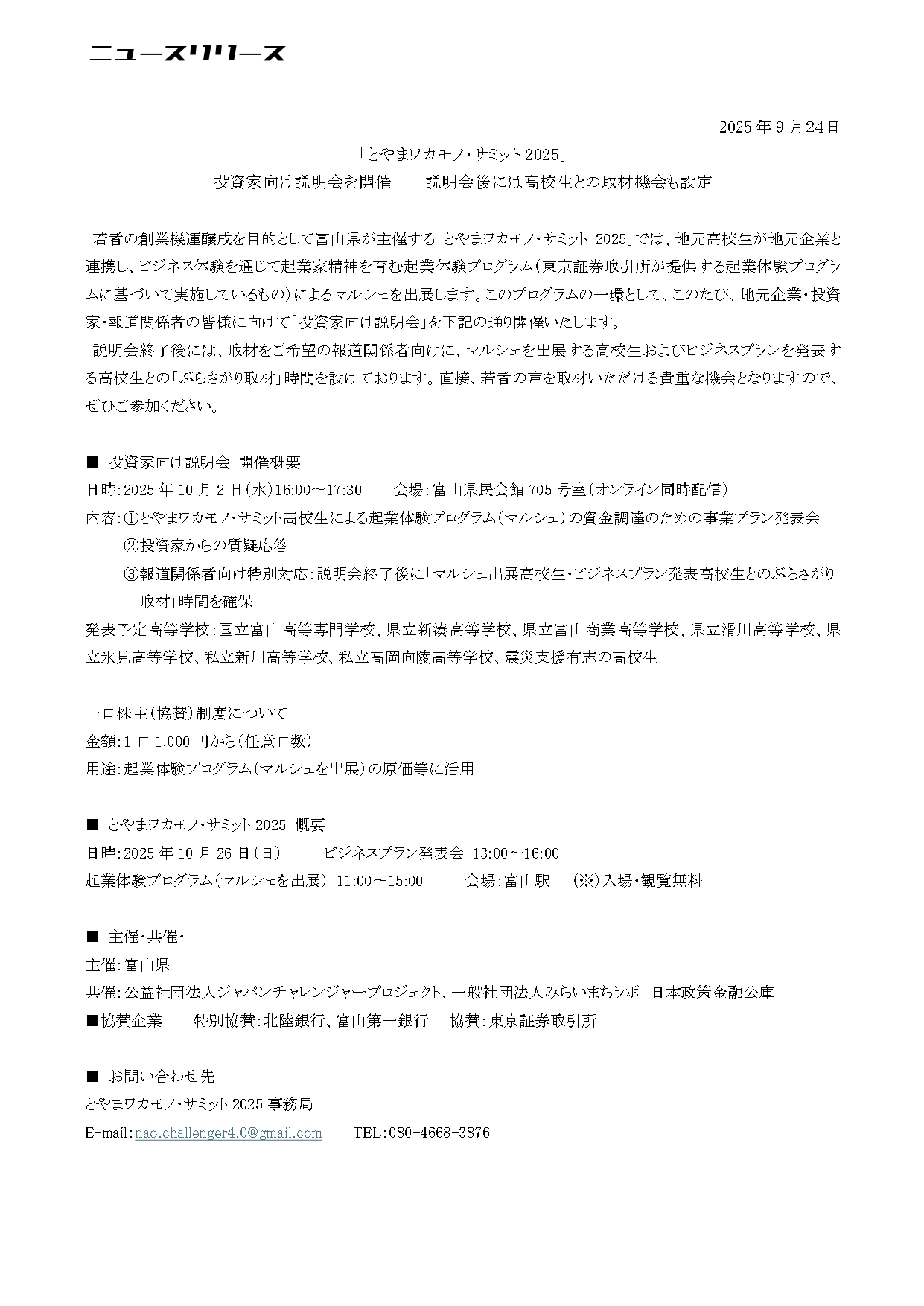 【投資家向け説明会・取材についてのご案内】とやまワカモノ・サミット2025