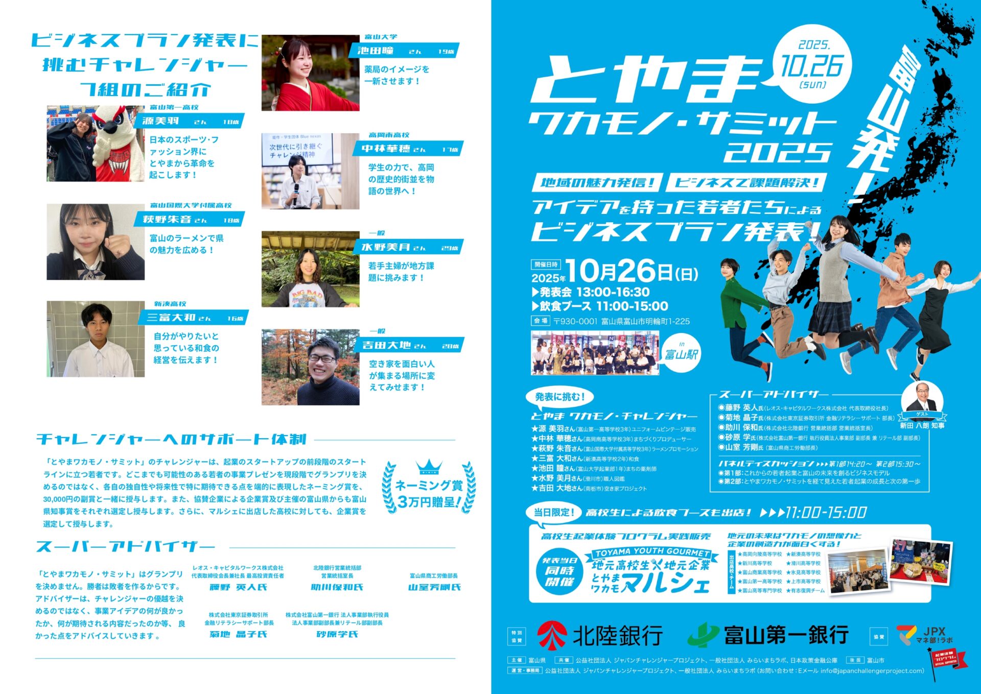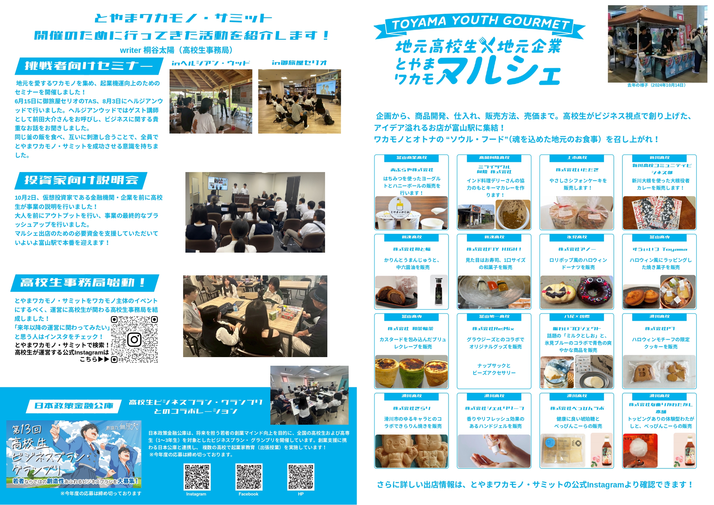 【とやまワカモノ・サミット2025 】 当日資料・プログラムのご案内 2025年10月20日 「とやまワカモノ・サミット2025」 パンフレットの内容を公開いたします!! プログラム内容やマルシェ出店情報など、当日の様子が一目でわかる内容になっています。皆様ぜひご覧ください! 開催日時:2025年10月26日 プロジェクト名:とやまワカモノ・サミット2025 日程:2025年10月26日 場所:富山駅 (富山県富山市明輪町1番225号) URL: 締切: 古い投稿 【開催告知】とやまワカモノ・サミット2025!!
