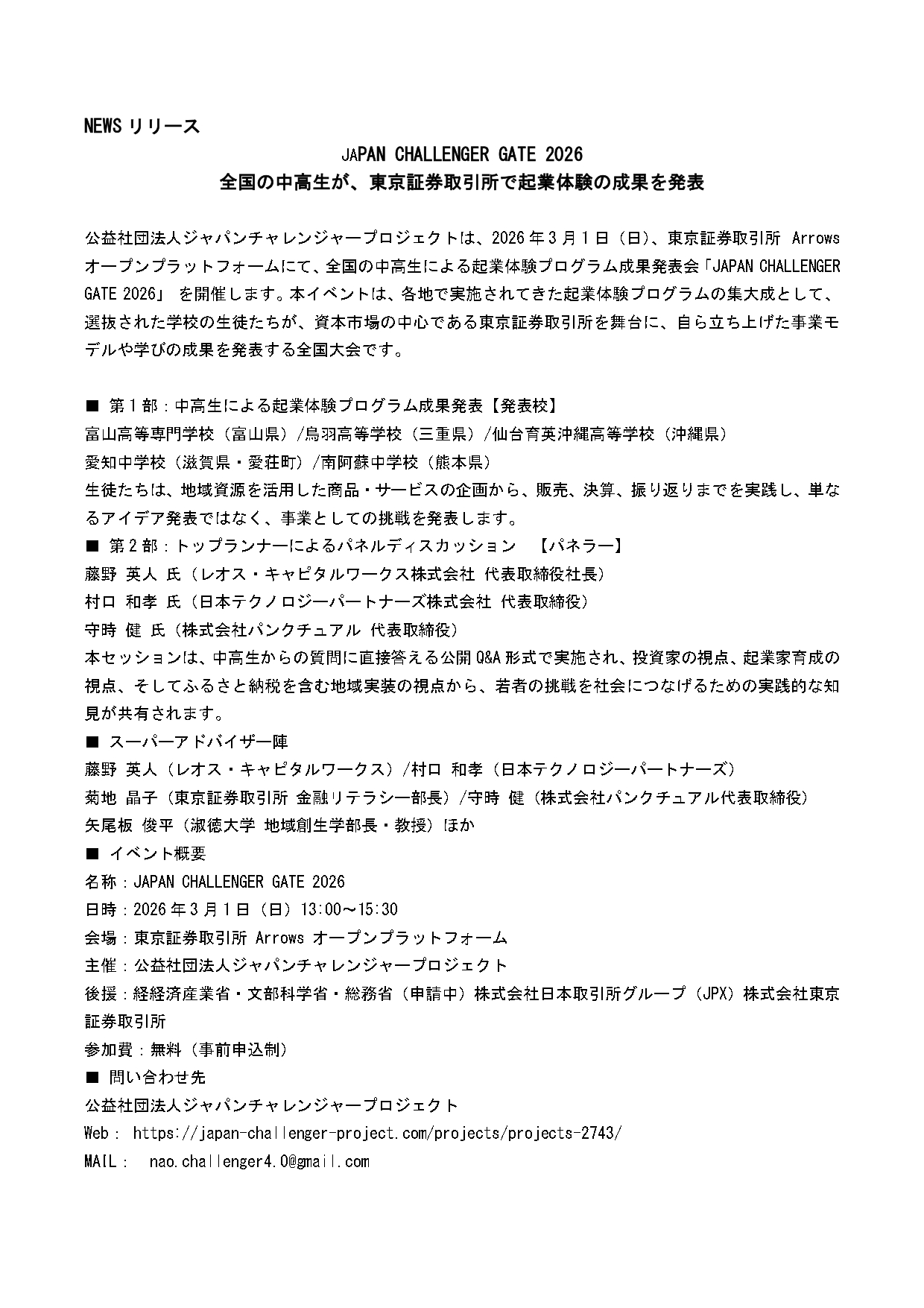 【JAPAN CHALLENGER GATE 2026】ニュースリリースを公開 2026年2月9日 開催日時:2026年03月01日 プロジェクト名:JAPAN CHALLENGER GATE 日程:2026年03月01日 場所:東証Arrows オープンプラットフォーム URL: 締切: 古い投稿 【JAPAN CHALLENGER GATE2026】東京証…